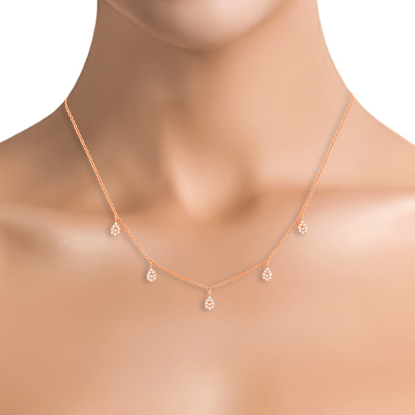 This rose gold-plated sterling silver zircon necklace is crafted from 925 sterling silver, featuring five zircon-studded drops placed at equal distance to each other. This delicate rose gold necklace is perfect for special occasion, elevating your outfits effortlessly with its nature-inspired radiant design.