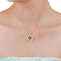 This radiant tourmaline pendant features a natural round tourmaline cabochon, set securely in a sterling silver prong setting surrounded by a sparkling zircon rim, adding to its brilliance. It comes with an 18-inch sterling silver chain, which sits perfectly on your neck, elevating your look effortlessly with its charming amber tone.